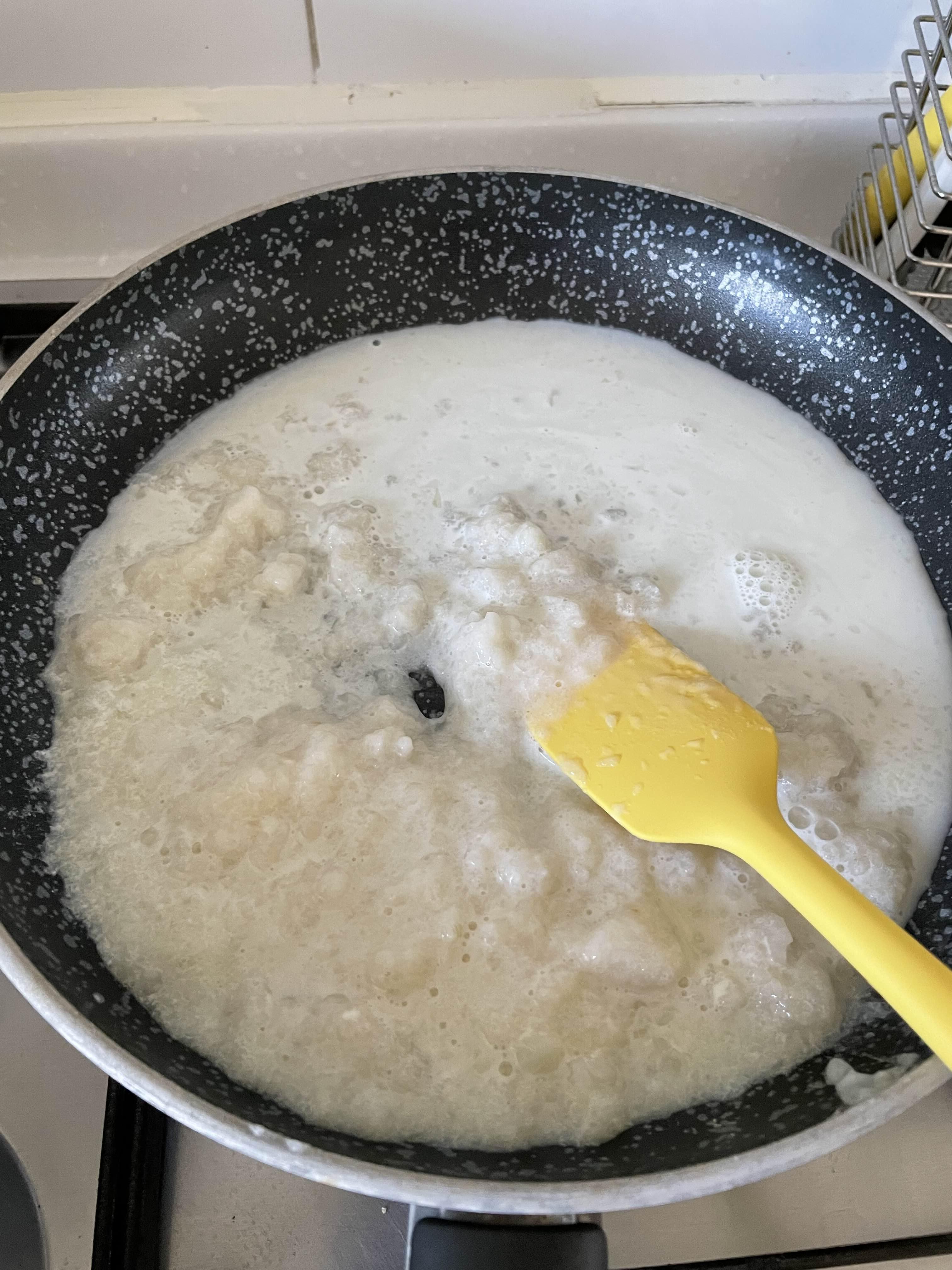 3. 분유 120ml를 넣고 약불로 볶아요.