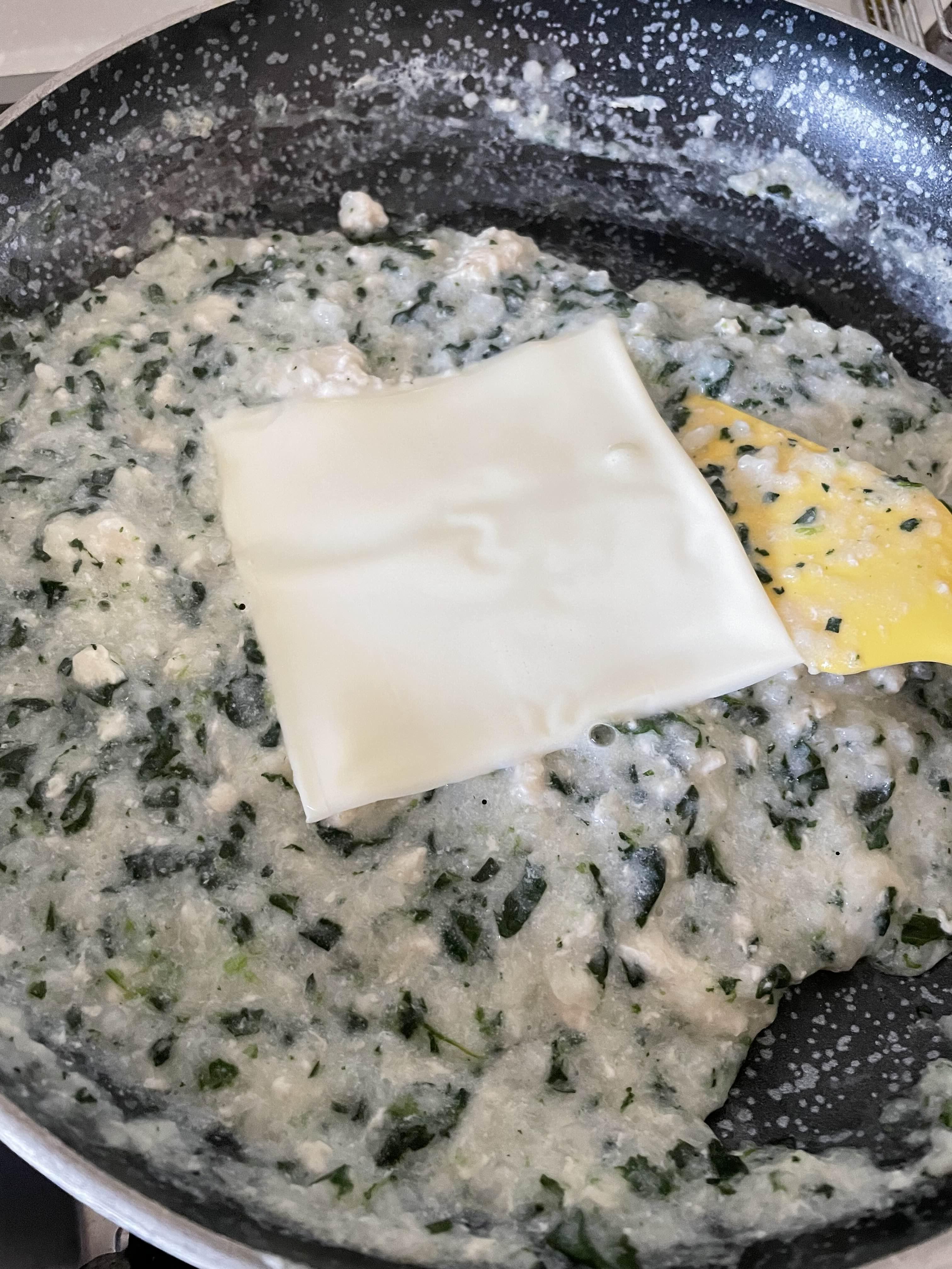 6. 아기치즈를 한 장 넣고 약불로 볶으면 끝이에요!