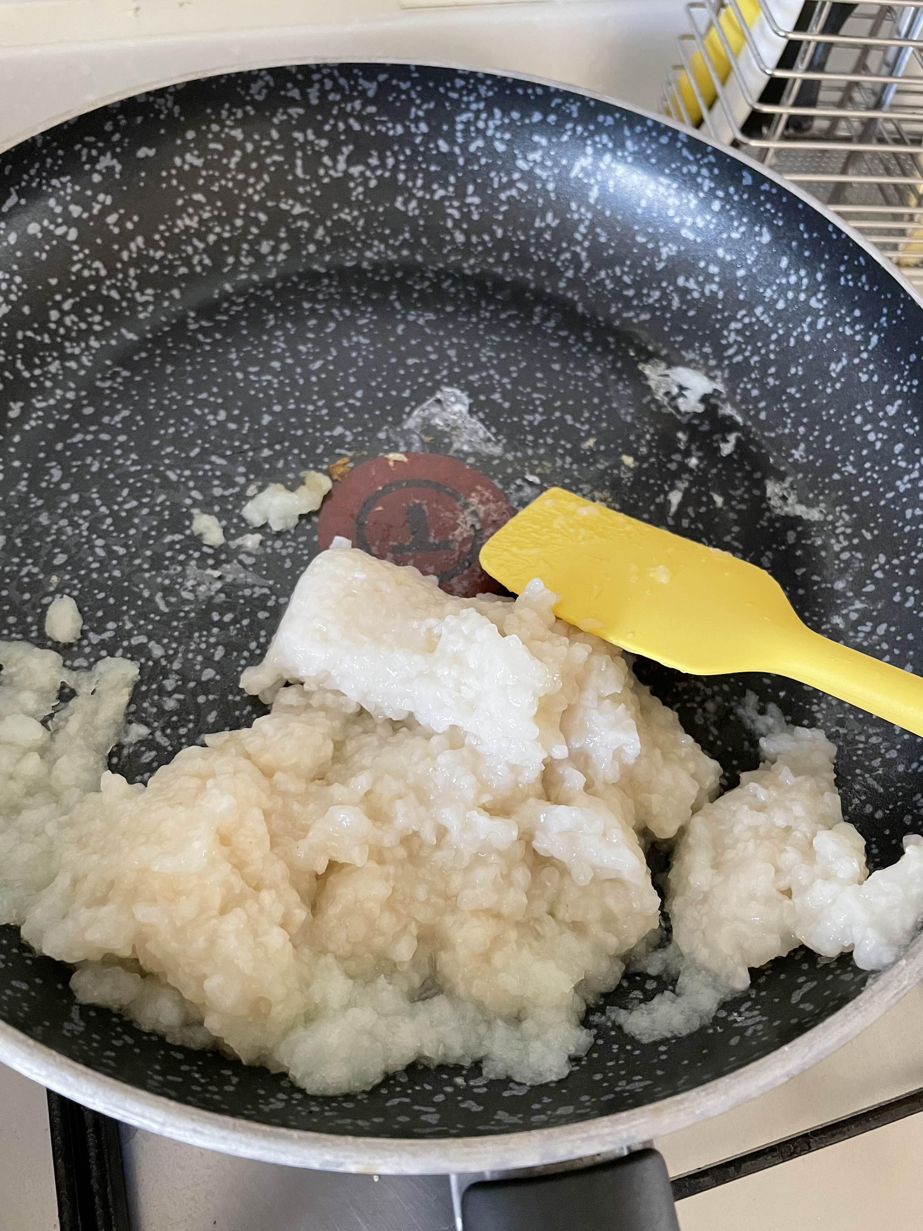 2. 무른밥 120ml를 넣고 약불로 볶아요.