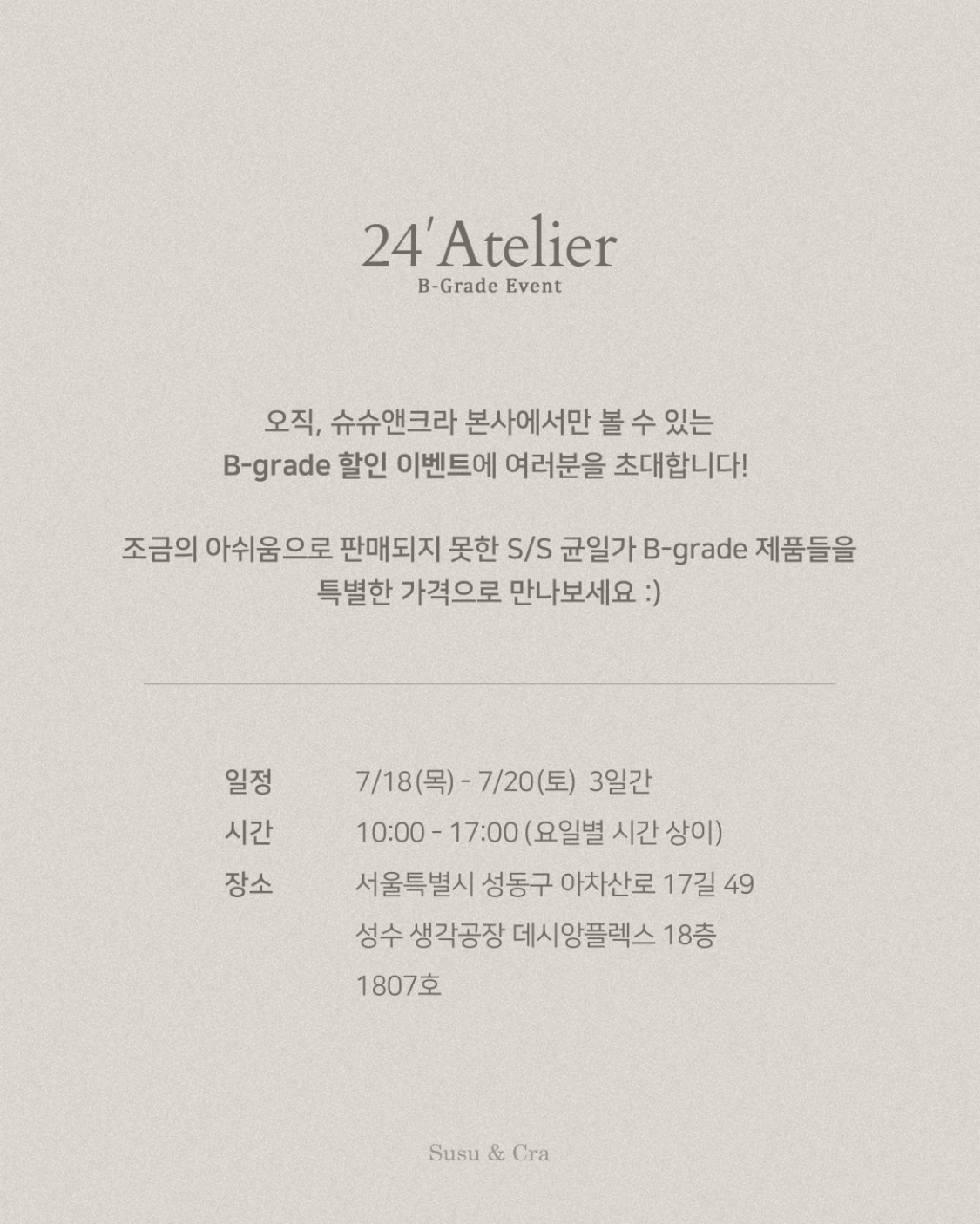 24'Atelier 이벤트 (B-grade행사 S/S 균일가 상품) 오직, 슈슈앤크라 본사에서만 볼 수 있는 B-grade 제품 이벤트가 다시 돌아왔어요! 조금의 아쉬움으로 판매되지 못한 B-grade 제품들을 특별한 가격으로